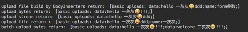 | builder.part("data", new ByteArrayResource("hello 一灰灰😝!!!".getBytes()) { @Override public String getFilename() { return "test.txt"; } }); builder.part("data", new ByteArrayResource("welcome 二灰灰😭!!!".getBytes()) { @Override public String getFilename() { return "test2.txt"; } }); parts = builder.build(); ans = webClient.post().uri("/upload").bodyValue(parts).retrieve().bodyToMono(String.class); ans.subscribe(s -> System.out.println("batch upload bytes return: " + s));