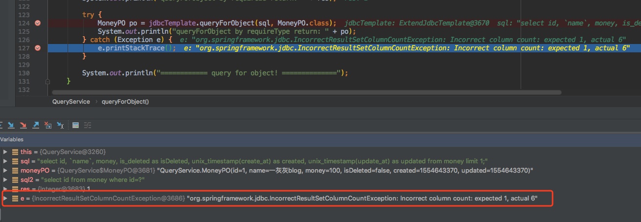 1 2 3 4 5 6 7 8 String sql = "select id, `name`, money, is_deleted as isDeleted, unix_timestamp(create_at) as created, unix_timestamp(update_at) as updated from money limit 1;" ; try { MoneyPO po = jdbcTemplate.queryForObject(sql, MoneyPO.class); System.out.println("queryForObject by requireType return: " + po); } catch (Exception e) { e.printStackTrace(); }