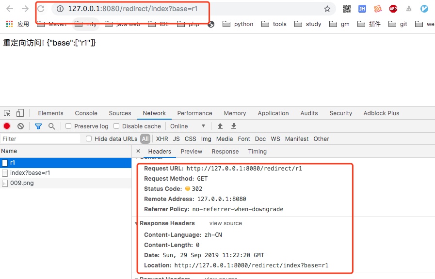 注意上面的截图,我们实际访问的连接是 http://127.0.0.1:8080/redirect/index?base=r1,在浏览器中的表现则是请求url变成了http://127.0.0.1:8080/redirect/index?base=r1;通过控制台查看到的返回头状态码是302