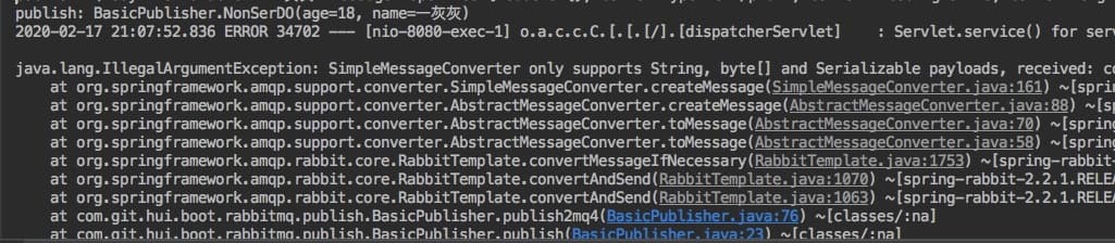 当我们调用上面的publish2mq4方法时,并不会是想象中的直接成功,相反抛出一个参数类型异常