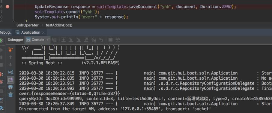 UpdateResponse response = solrTemplate.saveDocument("yhh", document, Duration.ZERO); solrTemplate.commit("yhh"); System.out.println("over:" + response); }