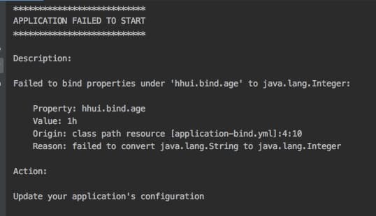 比如前面的配置类,我们实际的配置文件将age填18y,来看一下最终会发生什么事情