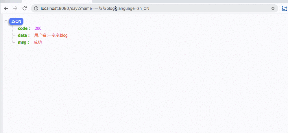 1 2 3 4 5 6 7 8 9 10 11 12 13 @GetMapping(path = "say") @ResponseBody public String say (String name) { RspWrapper res = new RspWrapper <>().setCode(200 ).setMsg(MsgUtil.get("200" )).setData(MsgUtil.get("name" ) + ":" + name); return JSON.toJSONString(res); } @GetMapping(path = "say2") @ResponseBody public String say2 (String name) { RspWrapper res = new RspWrapper <>().setCode(200 ).setMsg(MsgUtil.get("200" )).setData(MsgUtil.get("name" ) + ":" + name); return JSON.toJSONString(res); }