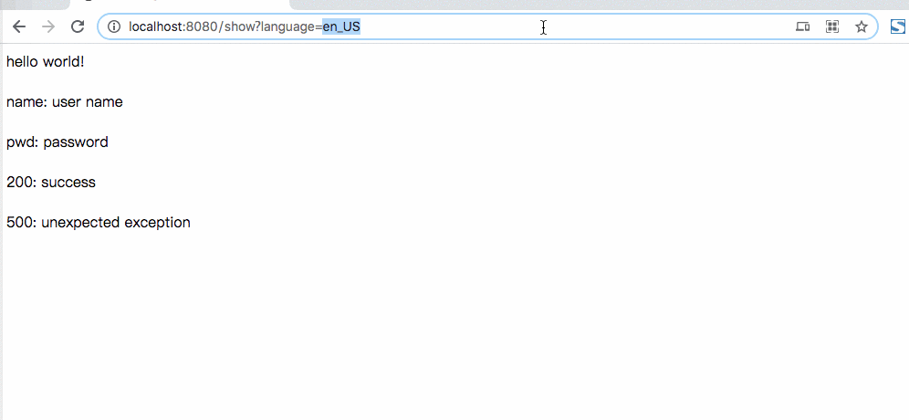 1 2 3 4 5 6 7 8 9 10 11 12 13 14 15 16 17 18 19 20 21 22 23 24 25 26 27 28 29 @Controller @SpringBootApplication public class Application { public Application (MessageSource messageSource) { MsgUtil.inti(messageSource); } public static void main (String[] args) { SpringApplication.run(Application.class); } @Data @Accessors(chain = true) public static class RspWrapper <T> { private int code; private String msg; private T data; } @GetMapping(path = "change") @ResponseBody public String changeLocal (String language) { String[] s = language.split("_" ); LocaleContextHolder.setLocale(new Locale (s[0 ], s[1 ])); RspWrapper res = new RspWrapper <>().setCode(200 ).setMsg(MsgUtil.get("200" )).setData(true ); return JSON.toJSONString(res); } }