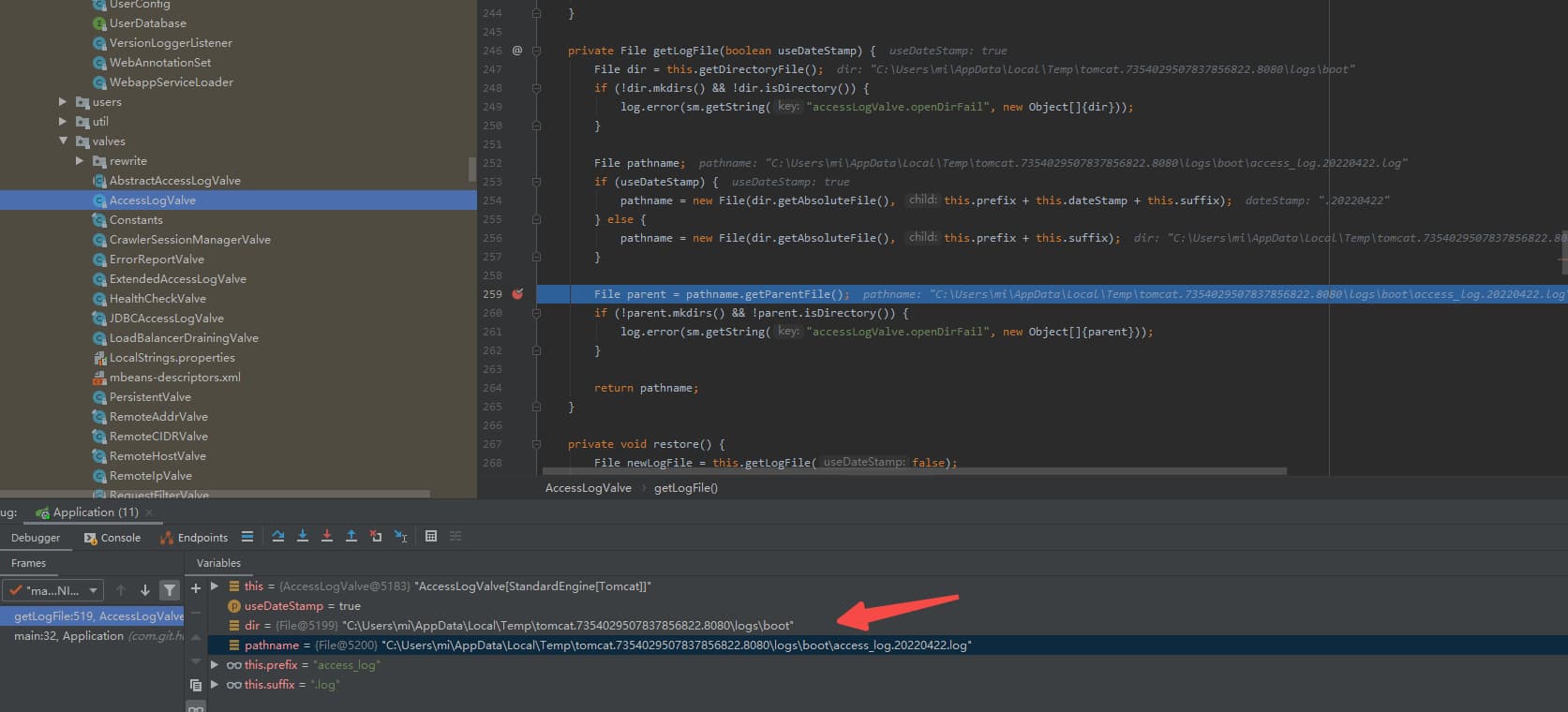 上面的第一项,给出了一个核心的类 AccessLogValve,一下子就找到关键点了,核心地方打个端点,启动一下看看是怎样的