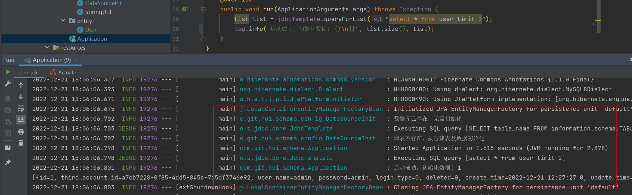 @Override public void run(ApplicationArguments args) throws Exception { List list = jdbcTemplate.queryForList("select * from user limit 2"); log.info("启动成功,初始化数据: {}\n{}", list.size(), list); } }