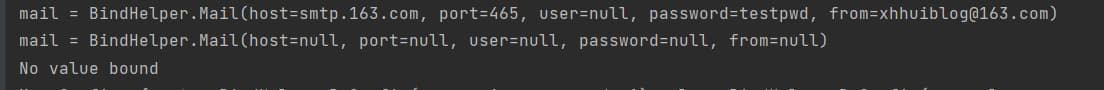 1 2 3 4 5 6 7 8 9 10 11 12 13 14 15 16 17 18 19 20 21 @Component public class BindHelper implements EnvironmentAware { private Environment environment; @Override public void setEnvironment (Environment environment) { this .environment = environment; } public void bindInfo () { Binder binder = Binder.get(environment); Mail mail = binder.bindOrCreate("demo.mail" , Mail.class); System.out.println("mail = " + mail); } }