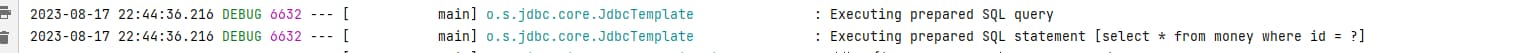 ```java Map map = jdbcTemplate.queryForMap("select * from money where id = ?", po.getId()); log.info("查询: {}", map);
