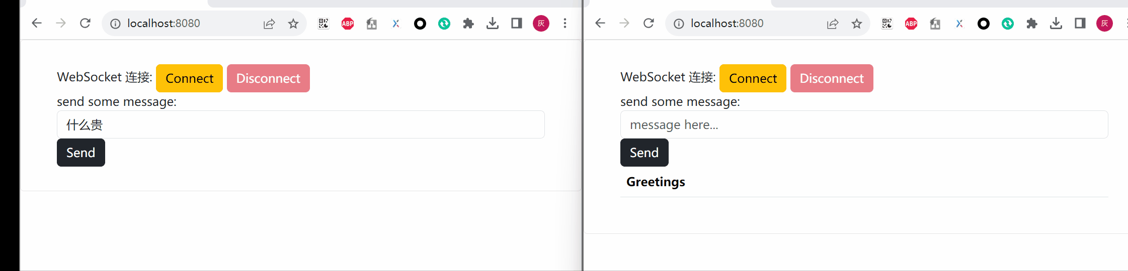 上面的动图展示了前端建立连接后,向后端发送信息并接收后端广播的消息的过程。由于两个客户端订阅的是同一个broker,因此后端发送的消息可以被所有客户端接收到。