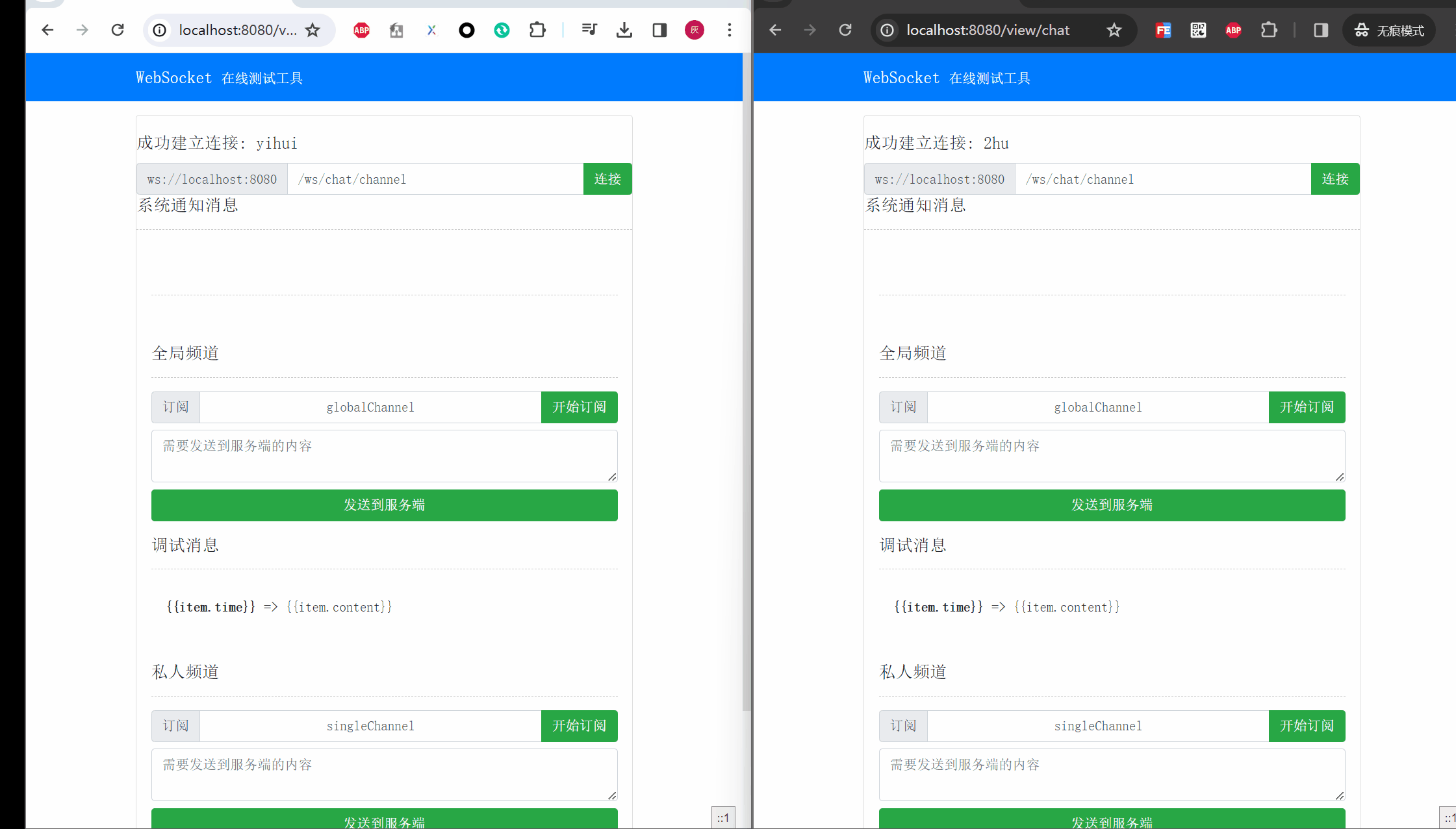 完整的前端代码可以参考项目源码中的 chat.html, 下面是关键的订阅/取消订阅逻辑