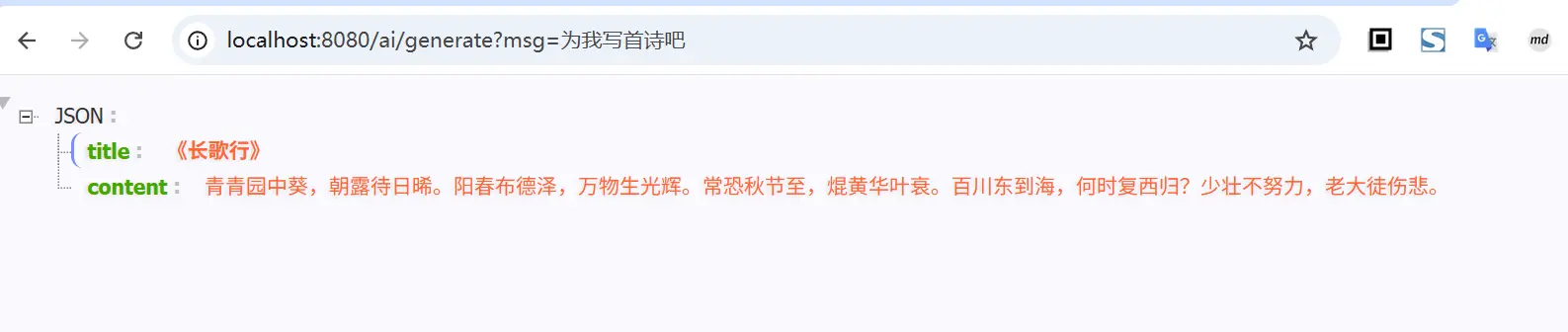 1 2 3 4 5 6 7 8 9 10 11 @GetMapping ("/ai/generate" )public Object generate (@RequestParam(value = "msg" , defaultValue = "你好" ) String msg) { Poem poem = chatClient.prompt() .system("你现在扮演盛唐著名的诗人李白,接下来我们进行对话" ) .user(msg) .call().entity(Poem.class); return poem; } record Poem (String title, String content) {}