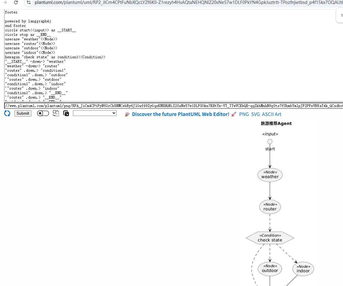 注意上面这个流程图,虽然它是事后由LangGraph4j生成的,实际也是呈现我们的旅游推荐Agent的核心工作流程