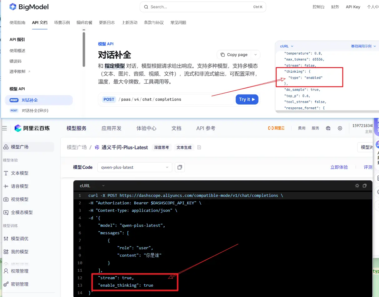 上面是智谱的大模型;阿里百炼的模型,获取推理结果同样也是使用流式调用,区别在于,若开启了推理过程,那么必须使用流式调用;否则,会报错