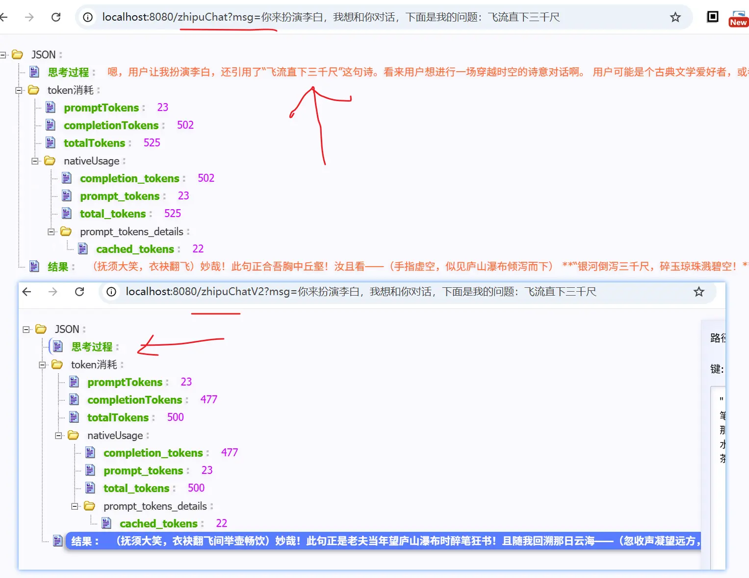 | @GetMapping(path = "zhipuChatV2") public Map zhipuChatV2(String msg) { ChatClient client = ChatClient.builder(zhipuModel) .defaultAdvisors(new SimpleLoggerAdvisor()) .build(); ChatResponse response = client.prompt(new Prompt(msg)).call().chatResponse(); var reason = response.getResult().getOutput().getMetadata().get("reasoningContent"); var content = response.getResult().getOutput().getText();