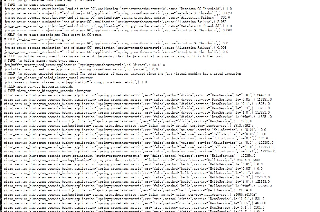 应用启动之后,就可以通过http://m-162d9nnes031u:8080/actuator/prometheus来查看收集的采样信息了,如